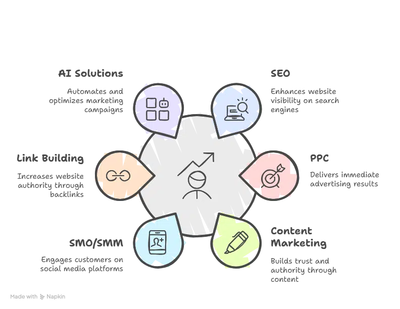 Not every strategy works for every business. But the best digital marketing services combine tried-and-true methods with innovative solutions that guarantee measurable growth. Let’s break them down with examples you can relate to: