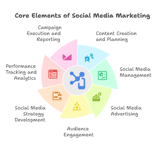 A strong social media marketing services strategy is made up of several core elements that work together to achieve your marketing goals: